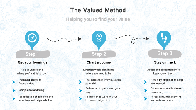 The Valued Method is a fancy name for the tried and tested support structure that we give our clients. It’s broken down into three steps that are designed to
